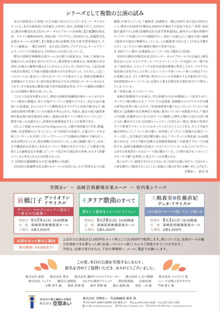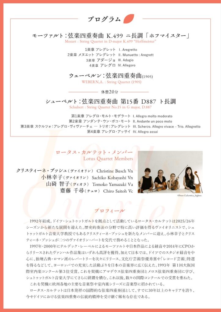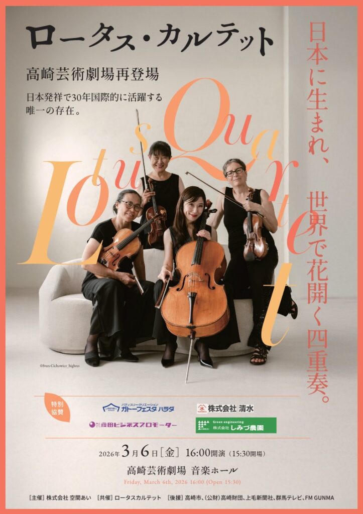 2023年には、高崎芸術劇場にてハイドン、メンデルスゾーン、シューベルトの名曲を演奏し、聴衆から高い評価を得ました。その節目を経て、今回はロータス・カルテットが大切にしてきた作曲家たちの弦楽四重奏曲を実演します。