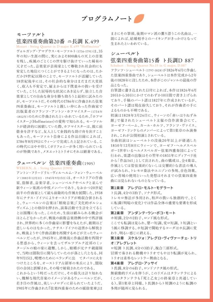 選ばれた3つの作品は、いずれも細やかな感情の揺らぎが光る名曲揃いです。四人で一つの楽器として息を合わせる彼女たちの一体感溢れる演奏を、ぜひホールでご体感ください。