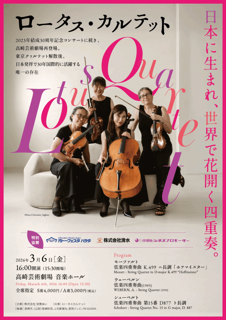 2023年には、高崎芸術劇場にてハイドン、メンデルスゾーン、シューベルトの名曲を演奏し、聴衆から高い評価を得ました。その節目を経て、今回はロータス・カルテットが大切にしてきた作曲家たちの弦楽四重奏曲を実演します。